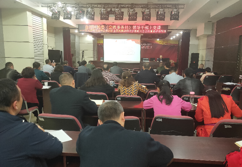 2019年10月31日,自治区民委(宗教事务局)买合木提·吾斯曼主任为全体党员干部上党课。讲述了亲自带领自治区民族模范代表参加表彰大会的感触。并就认真学习习近平总书记在全国民族团结进步表彰大会上的讲话精神,进行整理,与大家共同学习。
